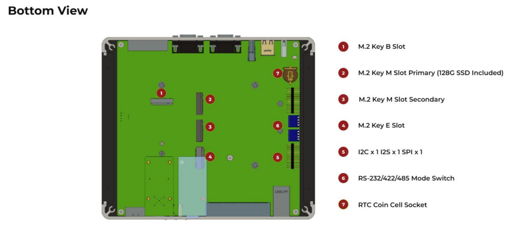 - 丰富连接性:双 M.2 Key M(NVMe);Key E(WiFi/BT)+ Key B(5G);1x 10GbE + 4x 1GbE;3x USB 3.0;2x USB-C