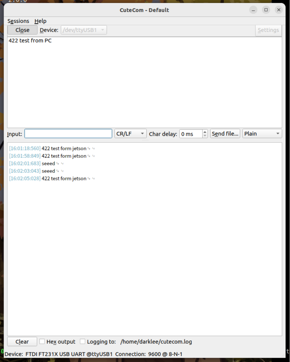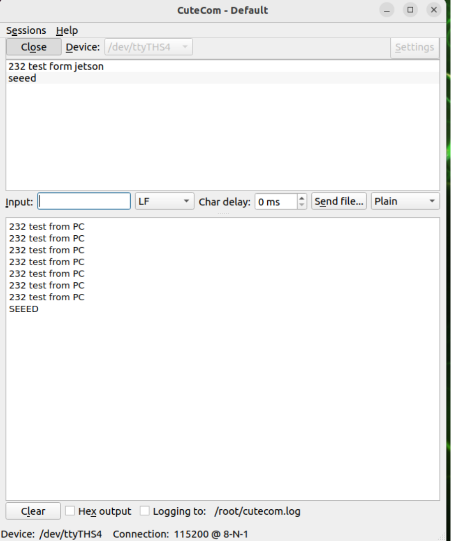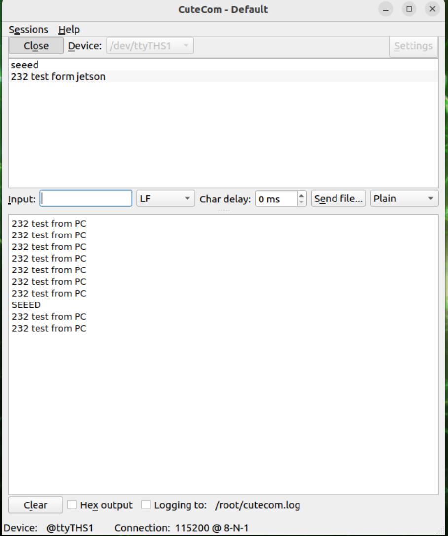 步骤 4:发送测试数据 发送测试数据(例如 "232 test from jetson")并验证从外围设备接收的数据。