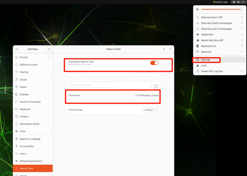 步骤 3. 在 Ubuntu 桌面上,点击右上角的下拉菜单,导航到 Settings > Date & Time,通过以太网线连接到网络并选择 Automatic Date & Time 自动获取日期/时间。