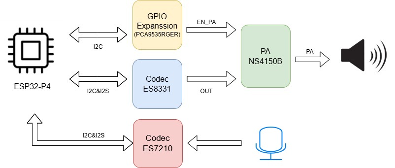 0x40):将模拟麦克风信号转换为数字 I2S 数据。 - ES8311 + PA 控制(PCA9535):将 PCM 转换为扬声器输出,并在回放时使能功放。