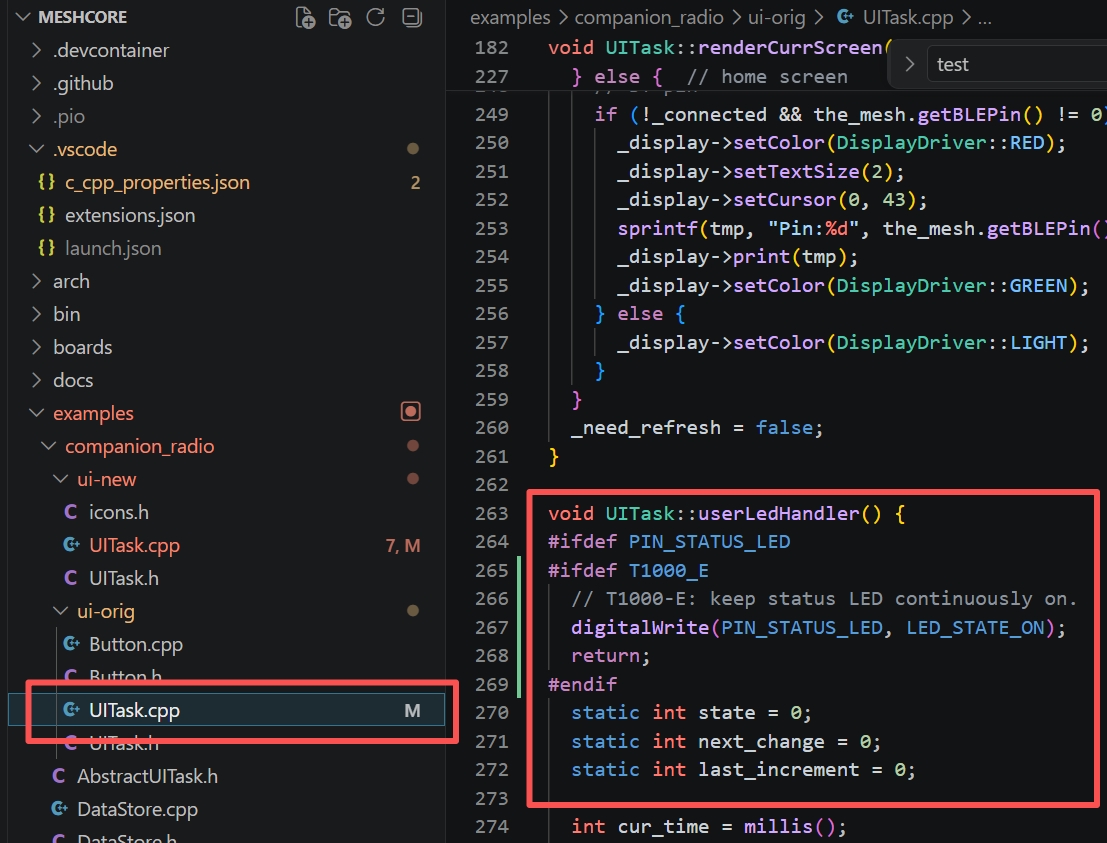 本示例演示如何控制用户指示灯常亮。将以下代码复制到 /examples/companion_radio/ui-new/ui-orig/UITask.cpp