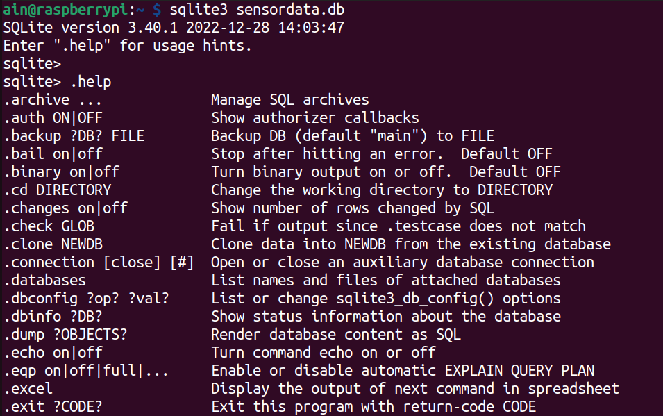 ain@raspberrypi:~ $ sqlite3 sensordata.db