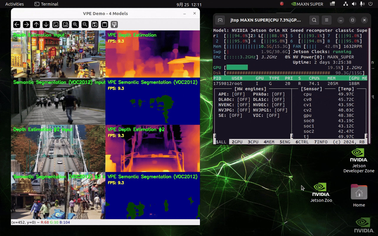 Visual Perception Engine is a cutting-edge framework that revolutionizes robotic perception by eliminating redundant computations through shared backbone networks. Unlike traditional approaches where each visual task runs independently, VPEngine uses a unified base model backbone (e.g., DINOv2) to extract image features only once, which are then reused by multiple task heads. This approach significantly reduces memory overhead and CPU-GPU data transfer while supporting dynamic task scheduling and seamless ROS2 integration.This wiki will show you how to use reComputer Robotics in conjunction with GMSL cameras to deploy the Visual Perception Engine to the edge.
