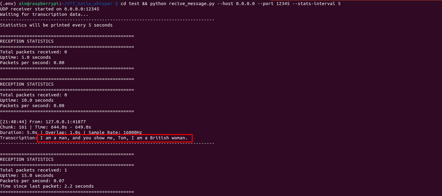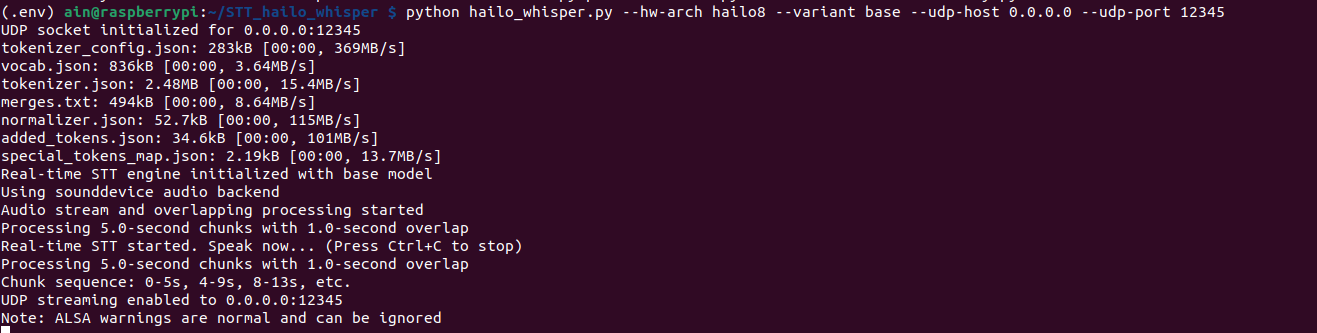 python hailo_whisper.py --hw-arch hailo8 --variant base --udp-host 0.0.0.0 --udp-port 12345