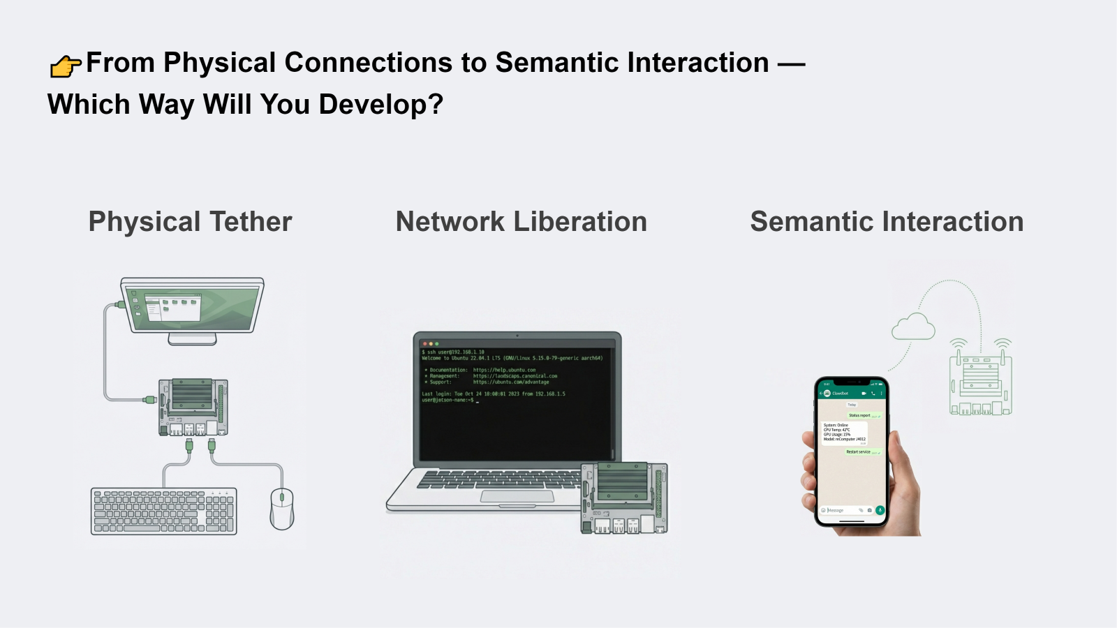 Traditionally, developing on a Jetson edge device required a physical setup with a monitor, keyboard, and mouse. Even with remote SSH access, developers still depended on terminal-based workflows and additional tools for monitoring and deployment. With Clawdbot, development becomes much simpler. Developers can now interact with the reComputer Jetson directly through a chat app like WhatsApp — sending messages to check device status, run commands, and debug scripts in a more convenient way.