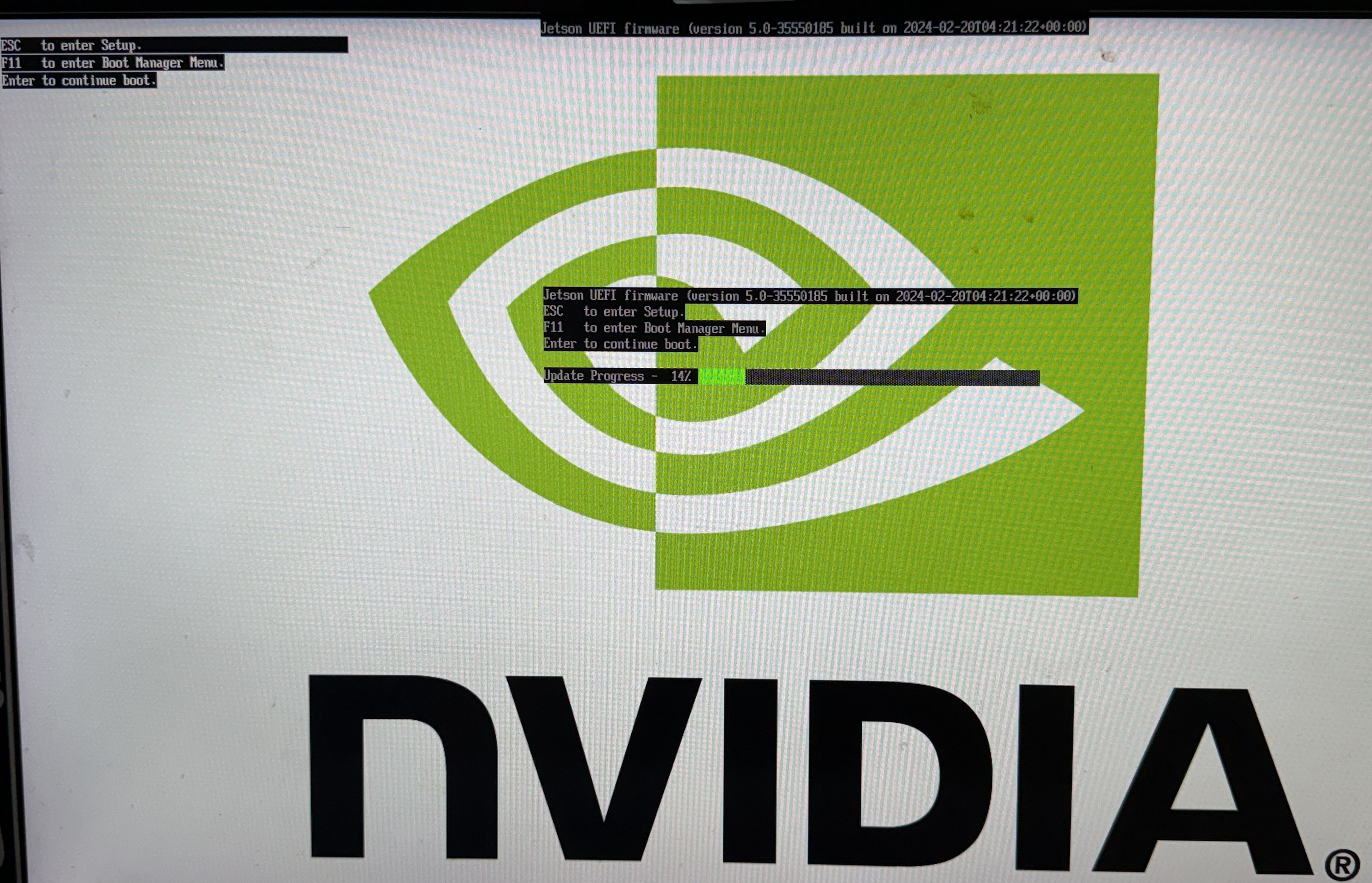 Después de que se ejecute el script, puedes reiniciar Jetson para iniciar el proceso OTA. Si tu dispositivo está conectado a un monitor, cuando reinicies, verás que el monitor mostrará el logo de Nvidia y luego entrará en kernel overlay. La pantalla permanecerá negra (un fenómeno normal) por un tiempo, y luego entrará en el proceso OTA.