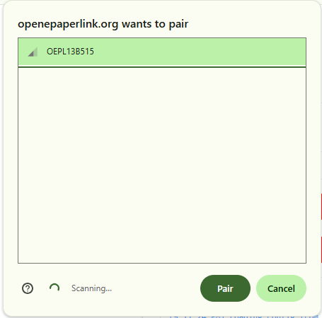 Haz clic en "Connect" y selecciona tu dispositivo OEPL del diálogo de emparejamiento Bluetooth.