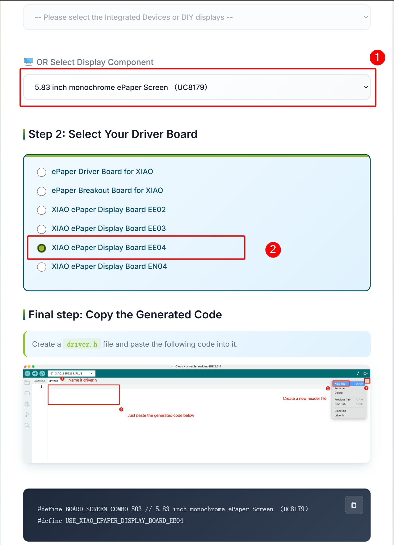 - Ingresa las especificaciones de la pantalla que estás usando en la página de la herramienta. Aquí, la pantalla seleccionada es la Pantalla ePaper monocromática de 5.83 pulgadas (UC8179), y la placa controladora es la Placa de Pantalla ePaper XIAO(ESP32-S3) - EE04.