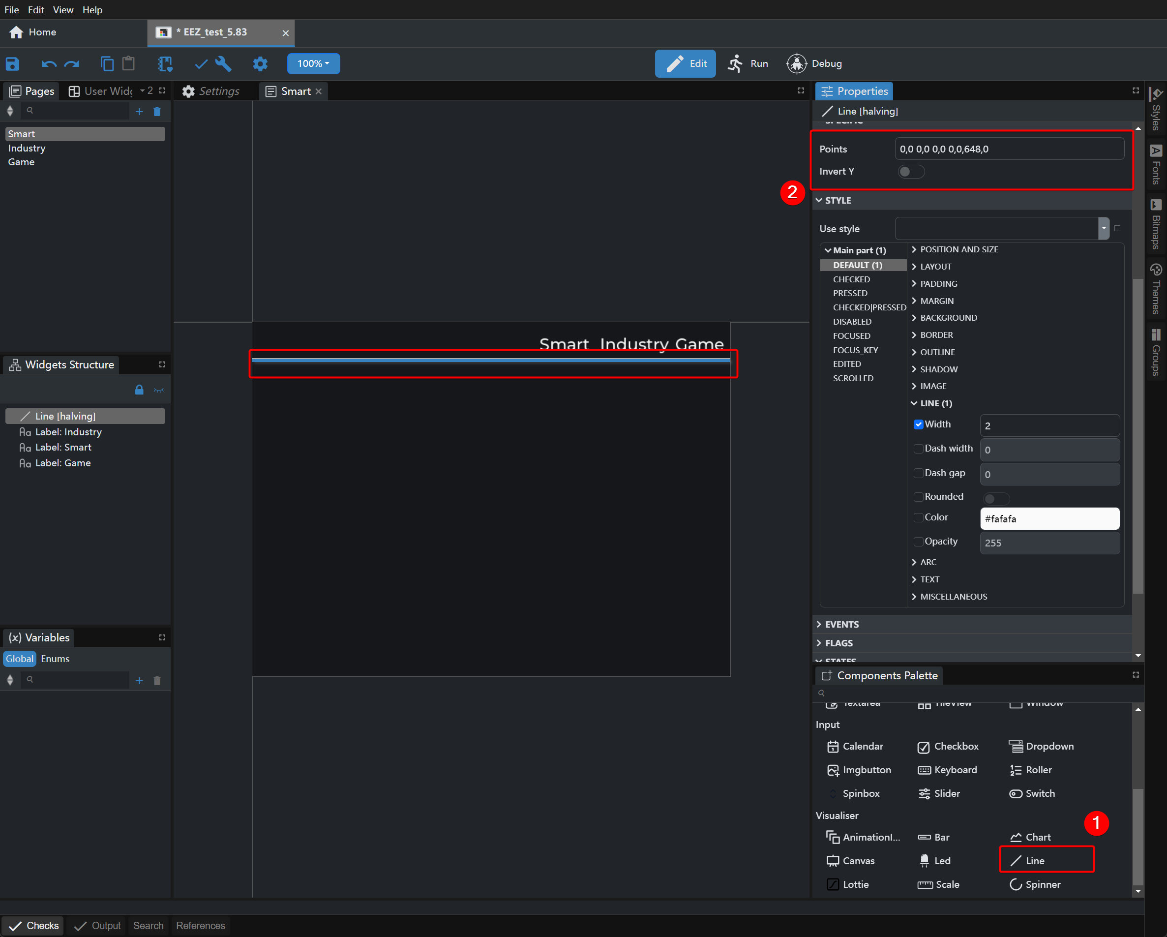 - Arrastra el componente Line al lienzo, y establece los puntos de inicio y fin en la sección Points para determinar la longitud y posición de la línea. Puntos de referencia: 0,0 0,0 0,0 0,0,648,0