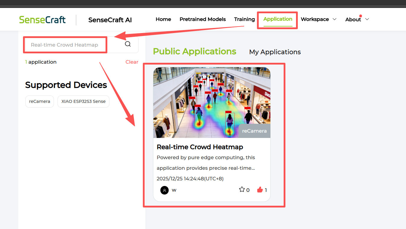 Ve a la plataforma SenseCraft - Application - cuadro de búsqueda e ingresa "Real-time Crowd Heatmap" para buscar, encuentra la aplicación llamada "Real-time Crowd Heatmap" y despliégala en tu reCamera.