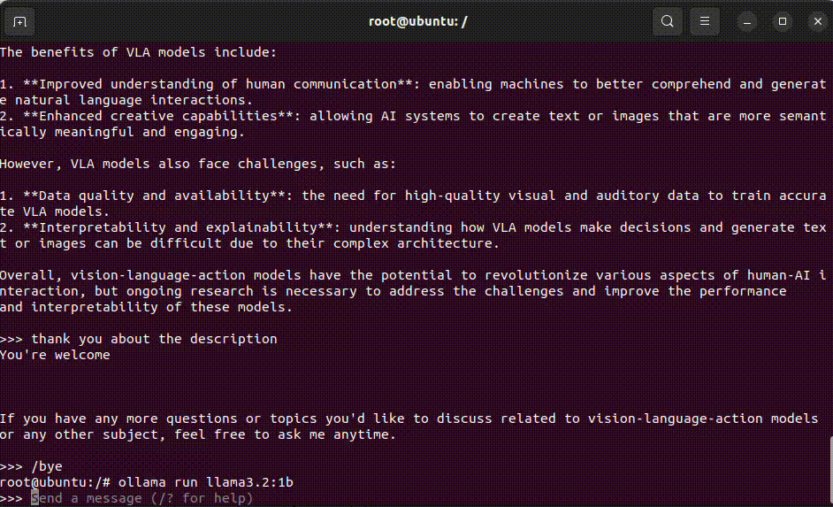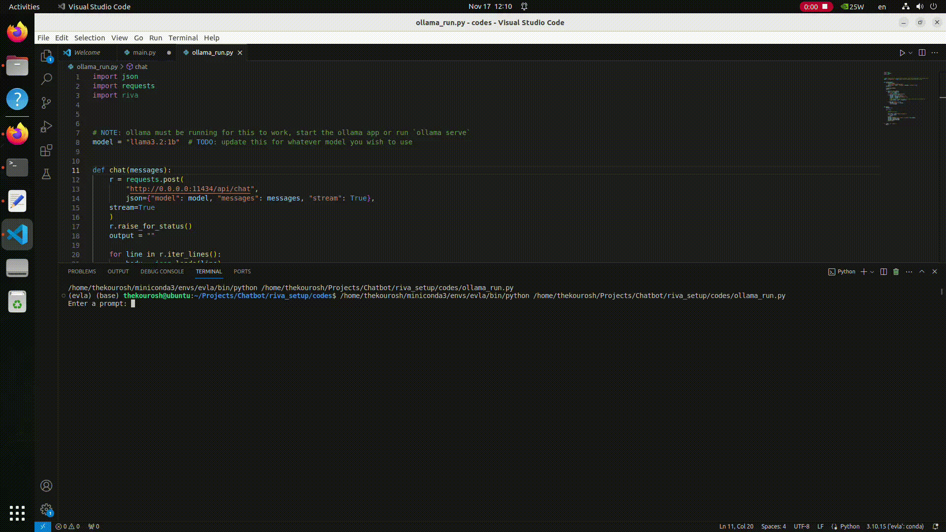 Ejecuta Ollama ya sea directamente en terminal o a través del script de Python proporcionado ollama_run.py.