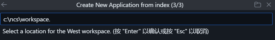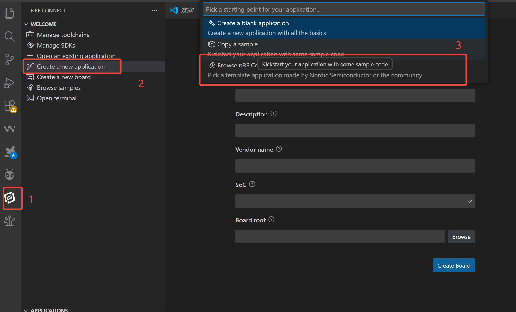 - Haz clic en el icono del plugin NCS -> Create a new application y selecciona el modo como Browse nRF Connect SDK Add-on Index.