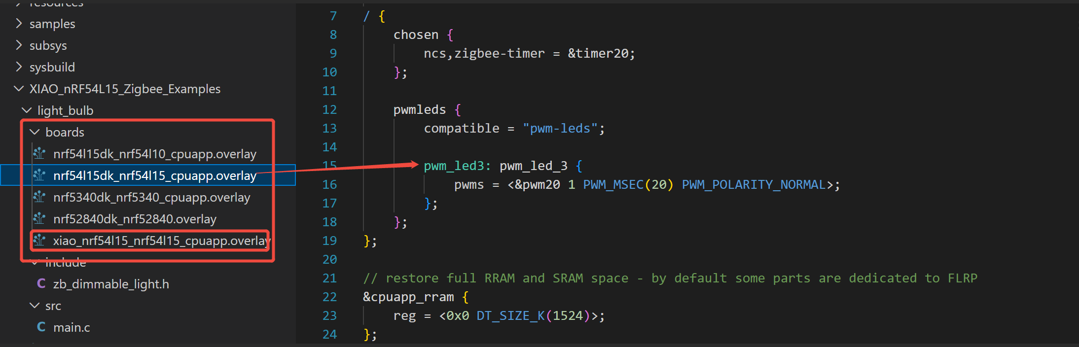 - Por ejemplo, xiao_nrf54l15_nrf54l15_cpuapp.overlay es una configuración específicamente escrita para XIAO nRF54L15 (por ejemplo, mapear el pin D3 al pin de control LED en el código);