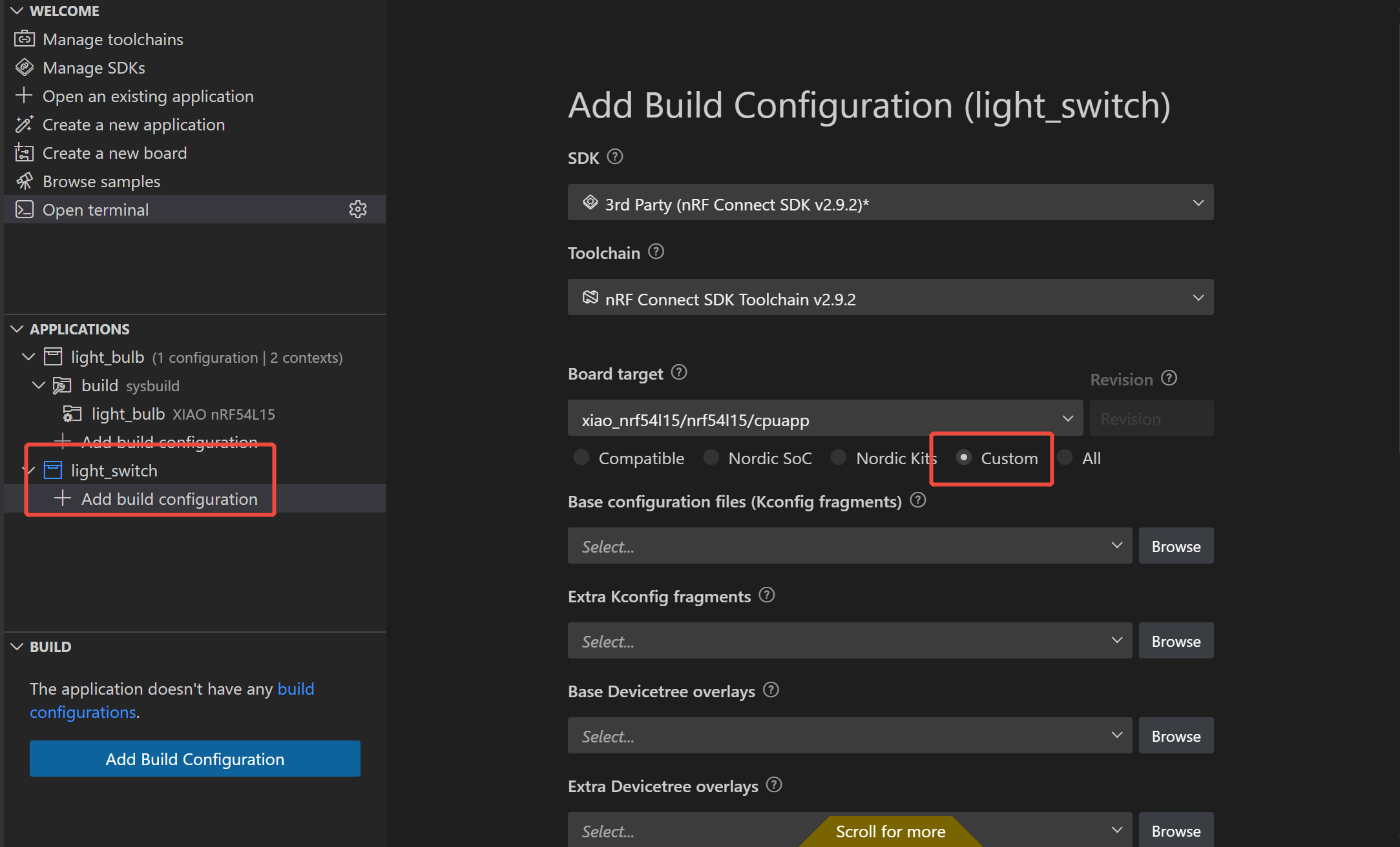 Agregar una configuración de construcción: En el panel "APPLICATIONS", verás el proyecto light_switch recién agregado. Haz clic en "+ Add build configuration" debajo de él.