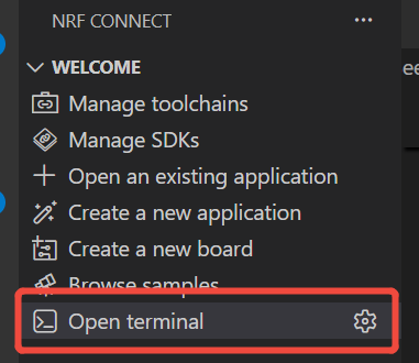 Abrir la terminal: En el panel WELCOME de la extensión NRF CONNECT, localiza y haz clic en la opción "Open terminal" (marcada por el cuadro rojo en la figura).