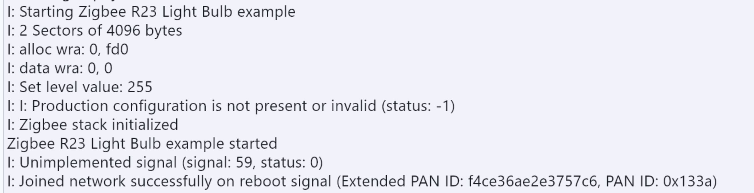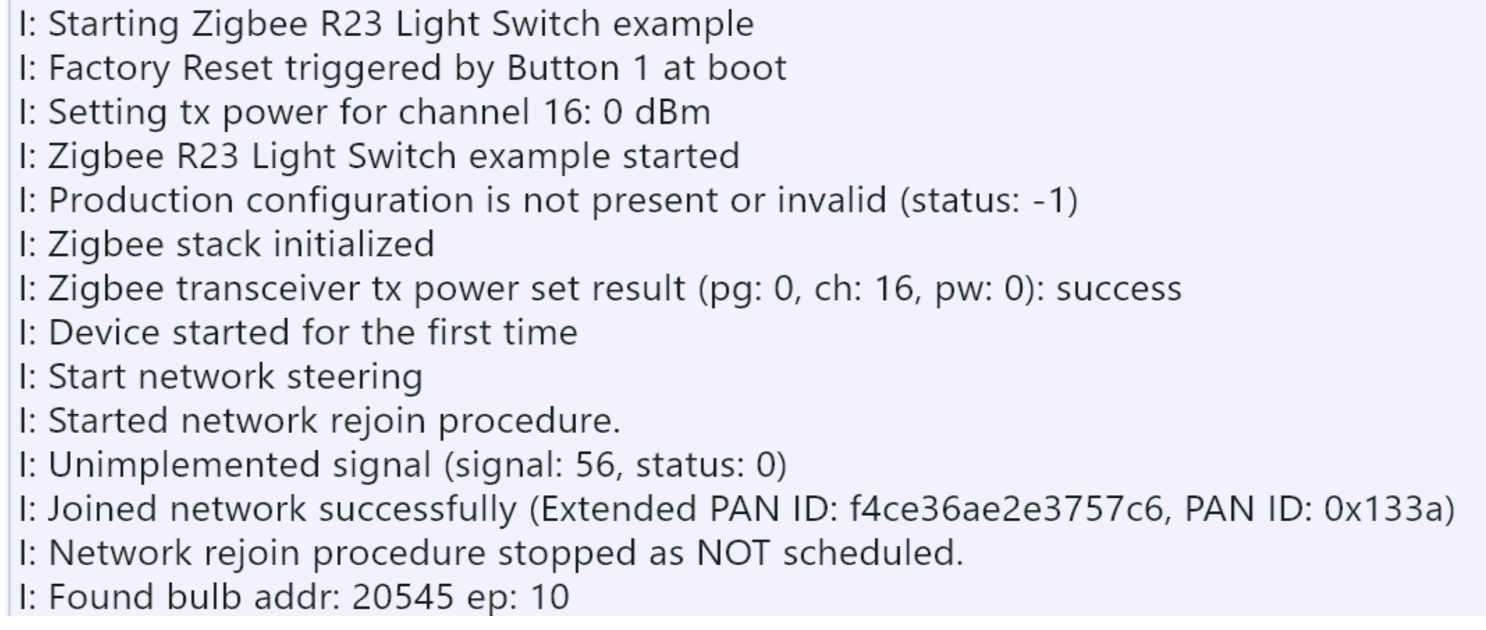 Verifica los registros del puerto serie para confirmar que el extremo de la bombilla se ha unido exitosamente a la red del coordinador. Referencia para los registros principales:
