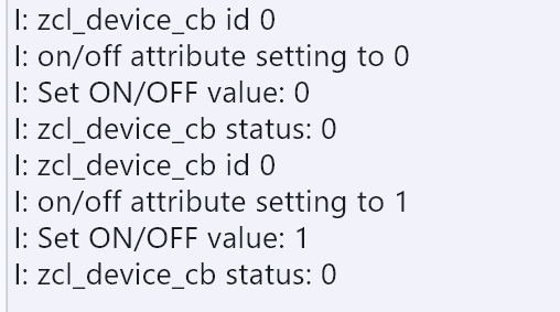- Verifica los registros del puerto serie del extremo de la bombilla para confirmar que el comando es recibido y ejecutado, y el LED completa la acción de encendido/apagado. Referencia para los registros principales: