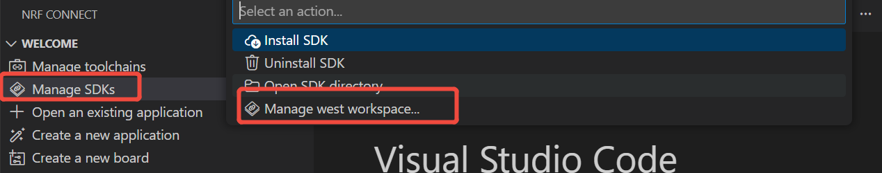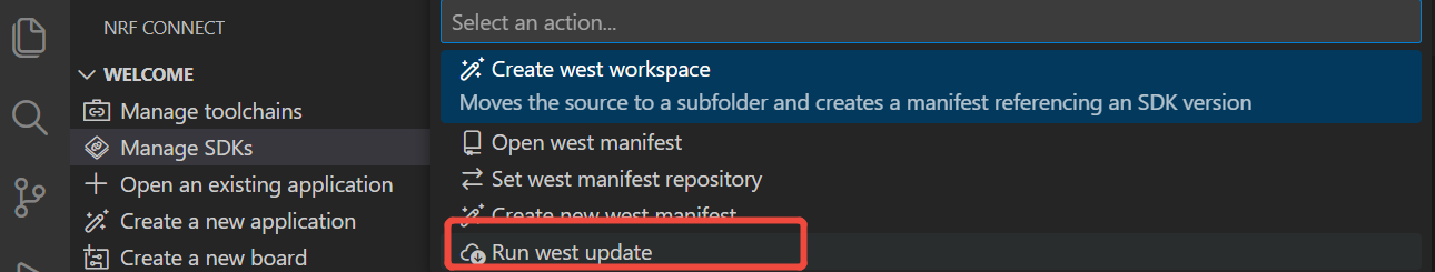 Si te preocupa que el nRF Connect SDK no se haya descargado completamente o tenga problemas, puedes verificar la integridad y corrección del nRF Connect SDK descargado de la siguiente manera. Selecciona Manage west workspace, luego selecciona West Update, como se muestra a continuación.