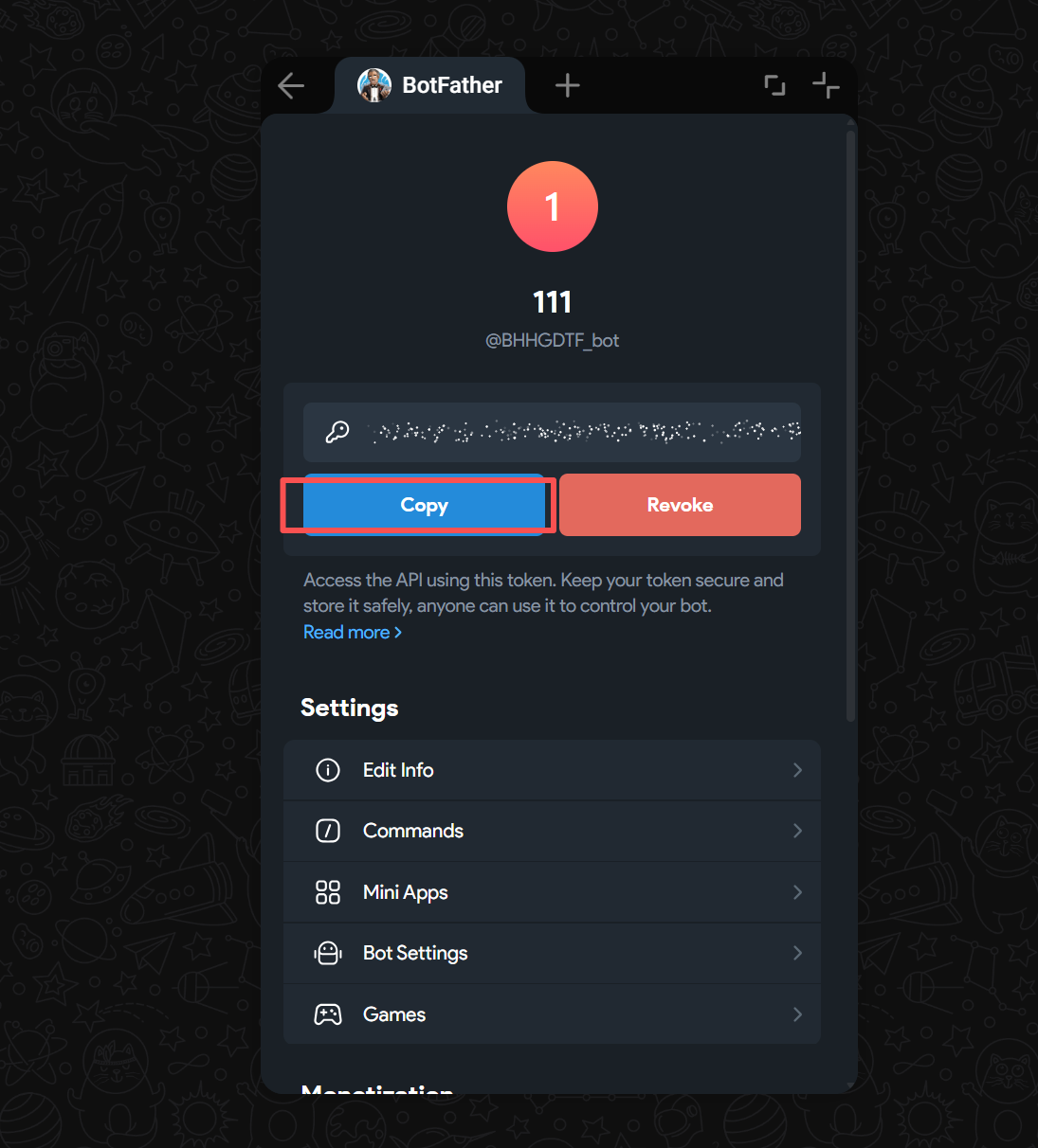 Then this interface will appear. After the keychain icon, there is a string of particle effects, which is the API of the Bot you created. Click "Copy" and you will use it later.