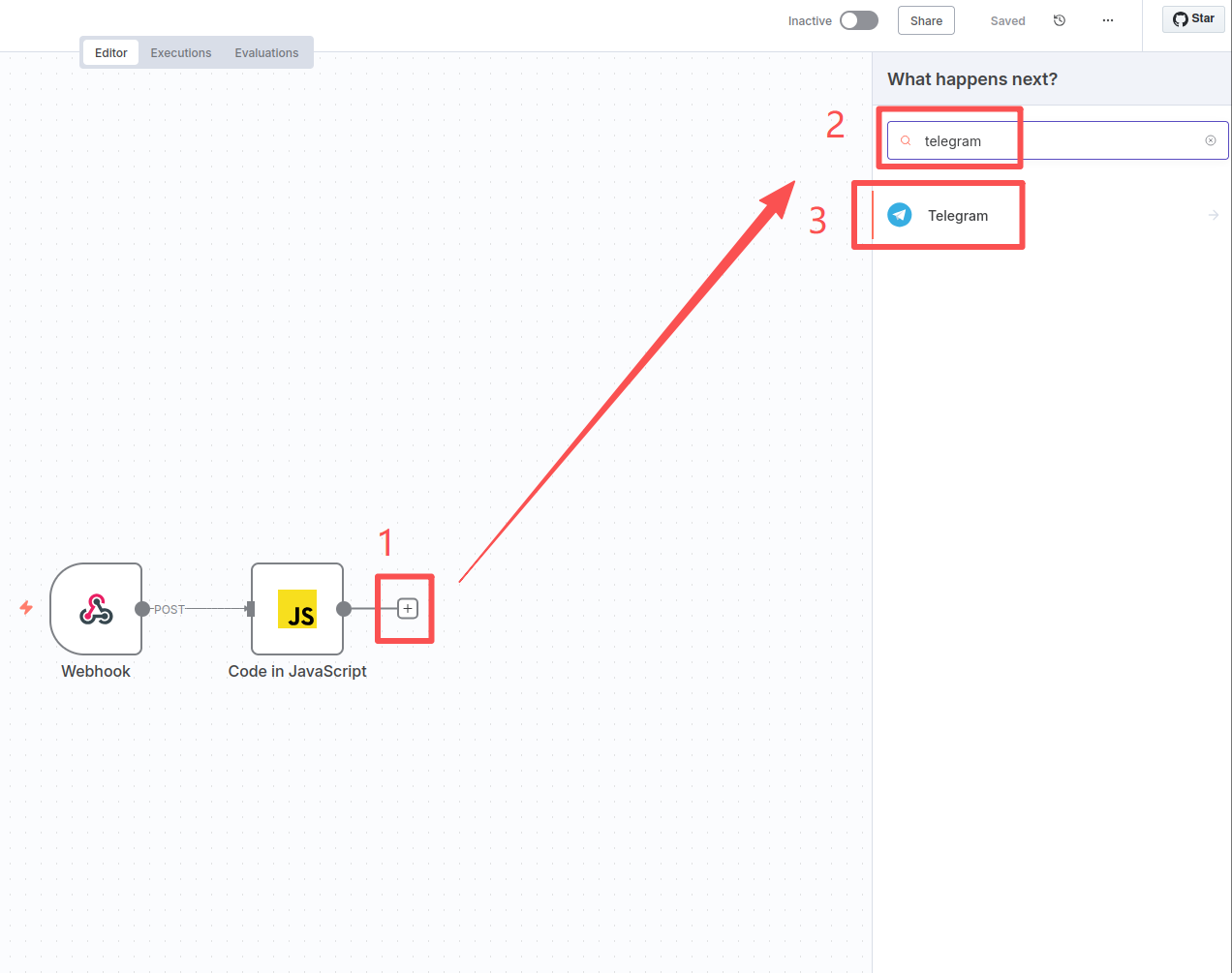 Click the plus sign-search box to enter "telegram"-click the first "Telegram" node