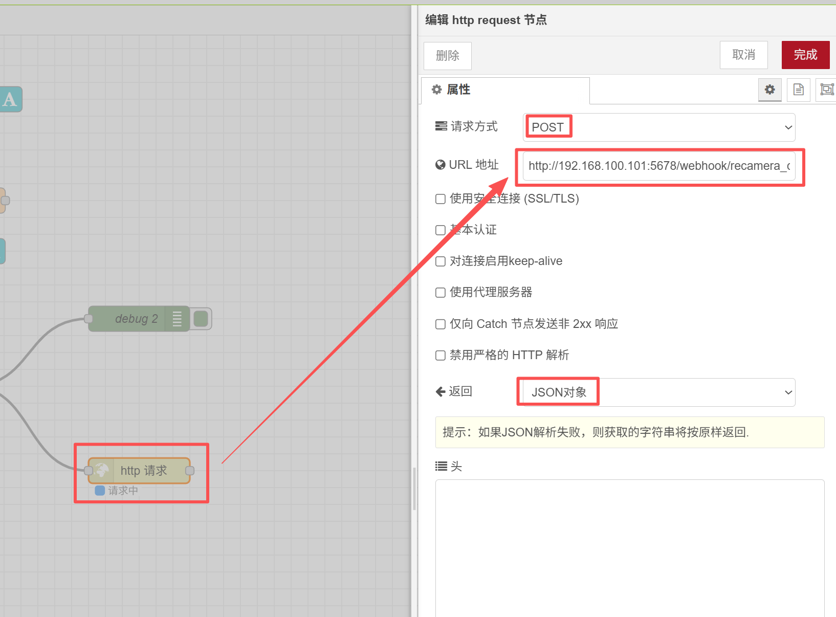 The previous configuration steps are the same as the Home Assistant, only when configuring the "http request" node, the URL address needs to be modified, that is, the POST address you just copied in the virtual machine, and then modify the localhost to the IP address of your virtual machine