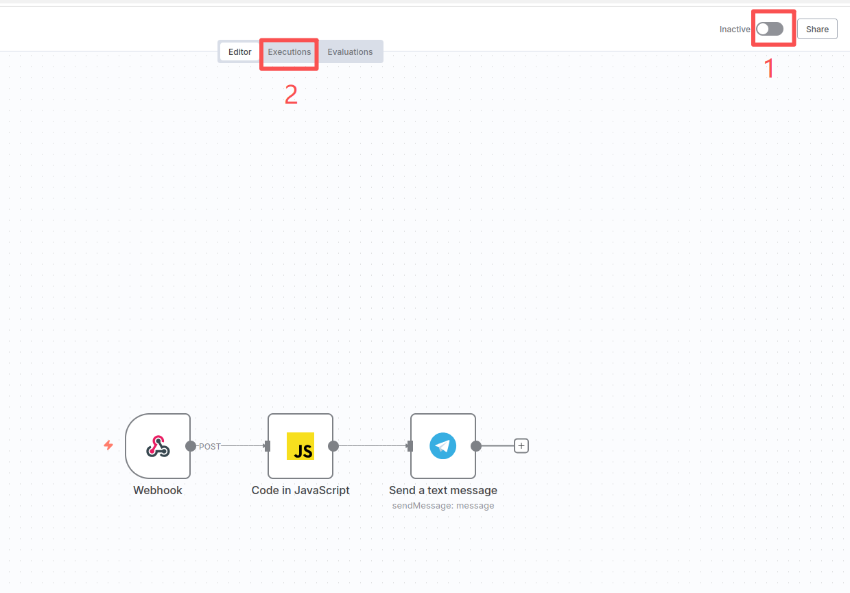 Click the "Inactive" switch in the upper right corner to turn it into green Active, then click "Executions"