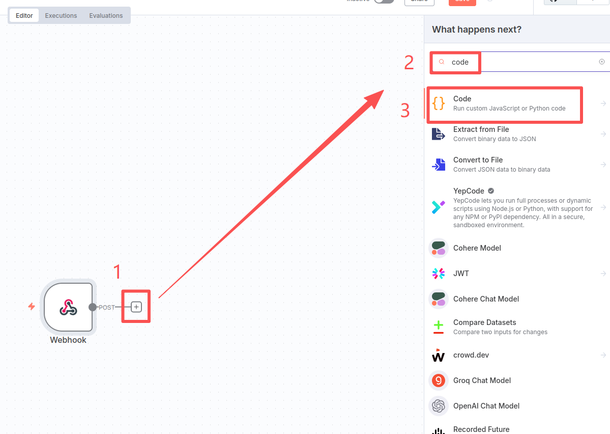 Click the plus sign-enter "code" in the search box-click the first "Code" node