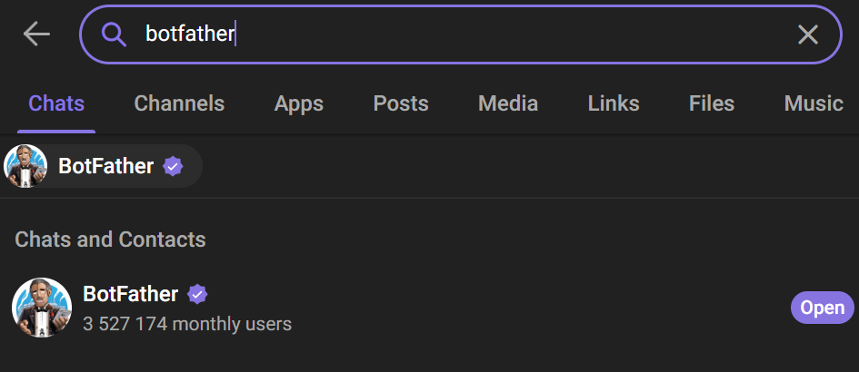 Open the Telegram and search for "BotFather"