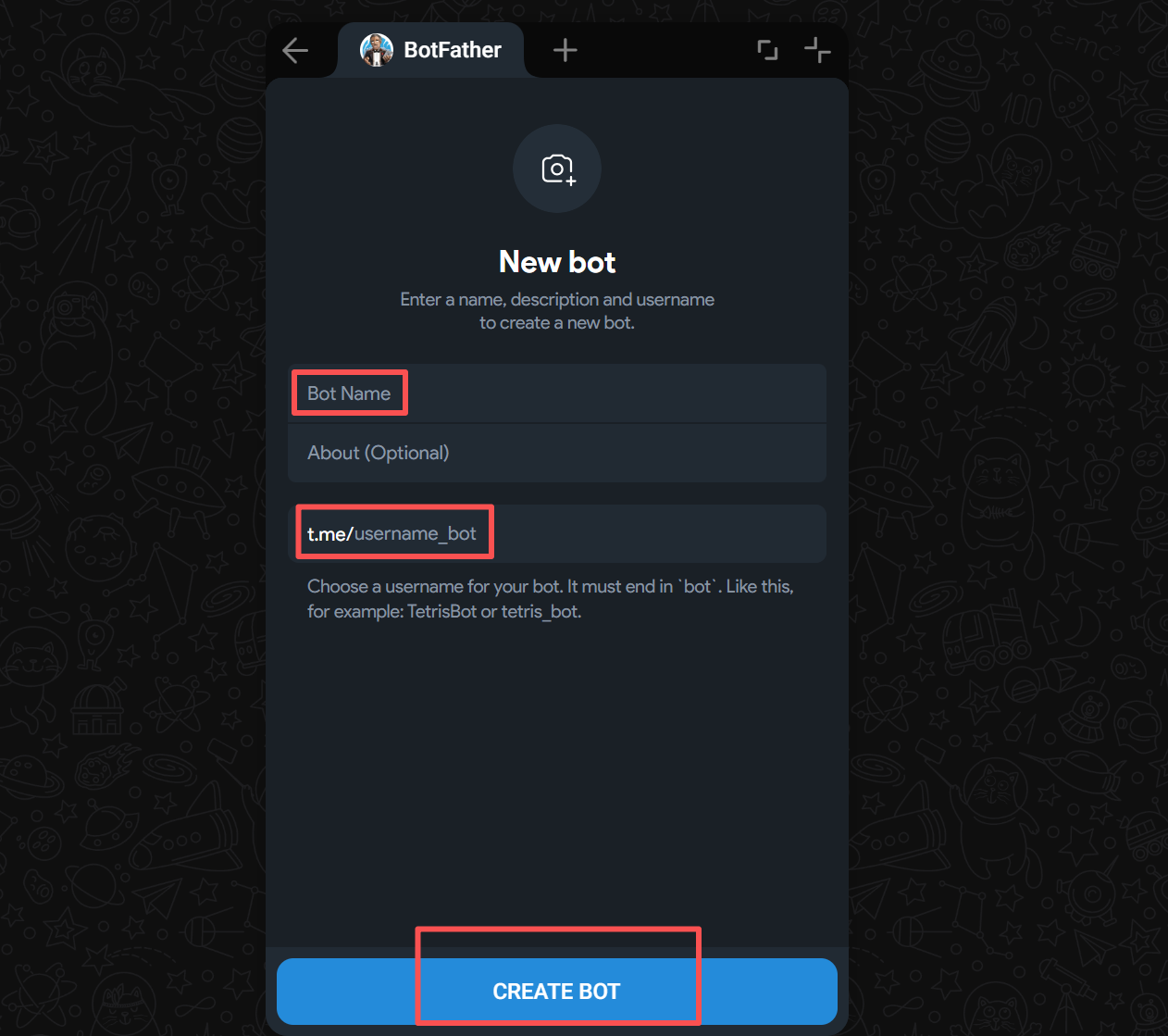 Create your Bot, fill in the robot name and user name, and then click "CREATE BOT"