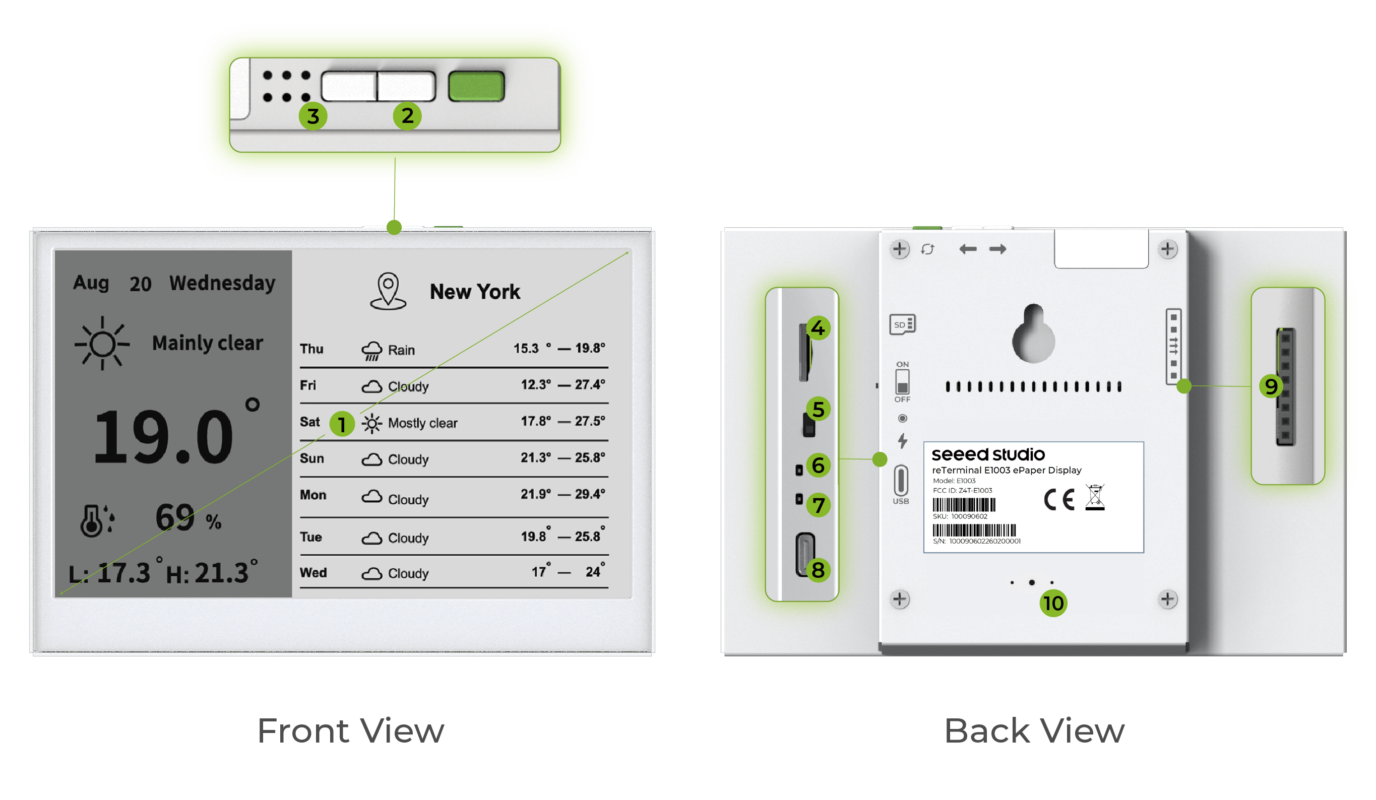 Single Press: Manually refreshes the display and checks for new content from the SenseCraft platform. The buzzer will beep once to confirm the action. This button is also commonly used to wake up the device. You can use this button to wake up a device when it has gone to sleep and a dashboard refresh command is usually not immediately available to the device.