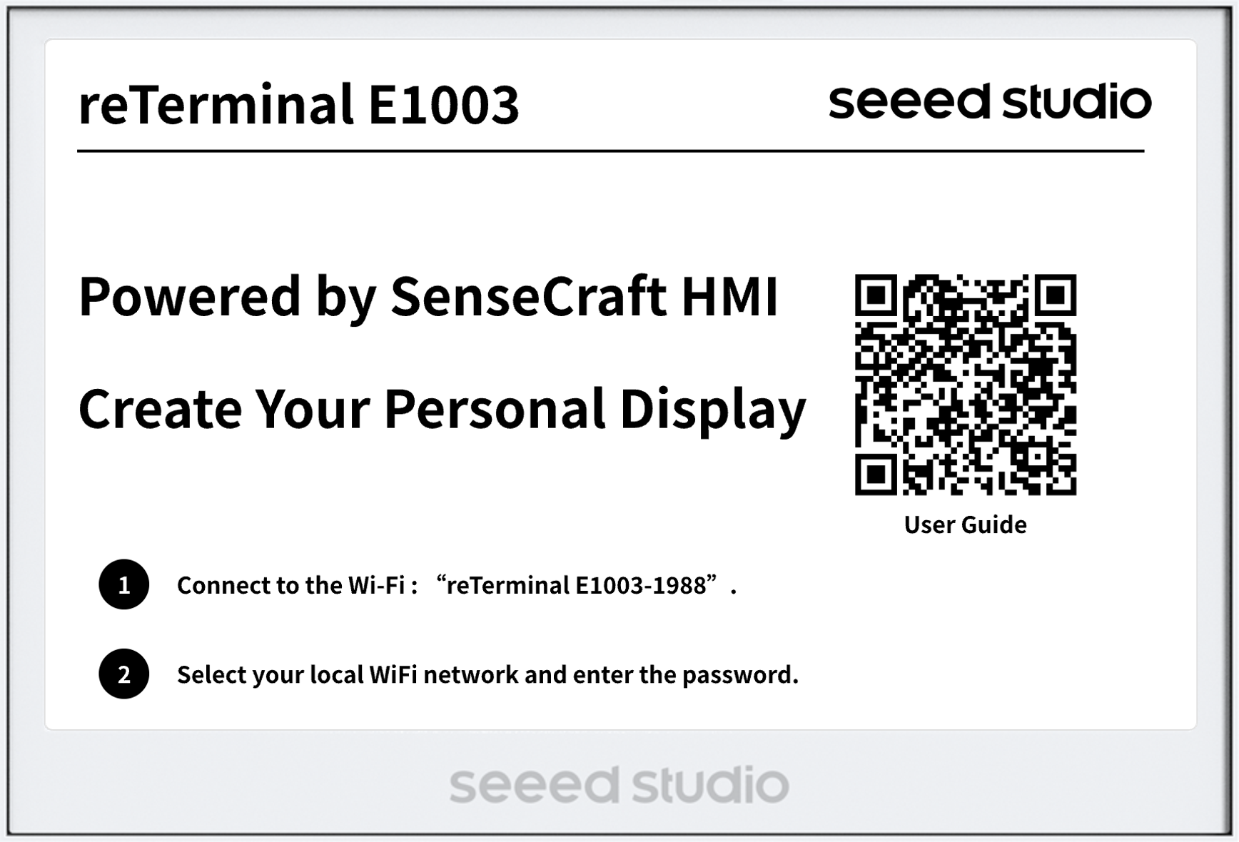 reTerminal E1003 is a 10.3 inch touch-supported, open-source monochrome ePaper display featuring 16 levels of grayscale and a high-resolution of 1404×1872 pixels, with up to 6-month battery life. Powered by ESP32-S3, it natively supports our SenseCraft HMI no-code UI platform for effortless dashboard creation. Whether for smart home dashboard visualization and control, office information displays, or educational projects, this ready-to-use touch-enabled device delivers stunning visuals and flexible customization to meet all your needs.