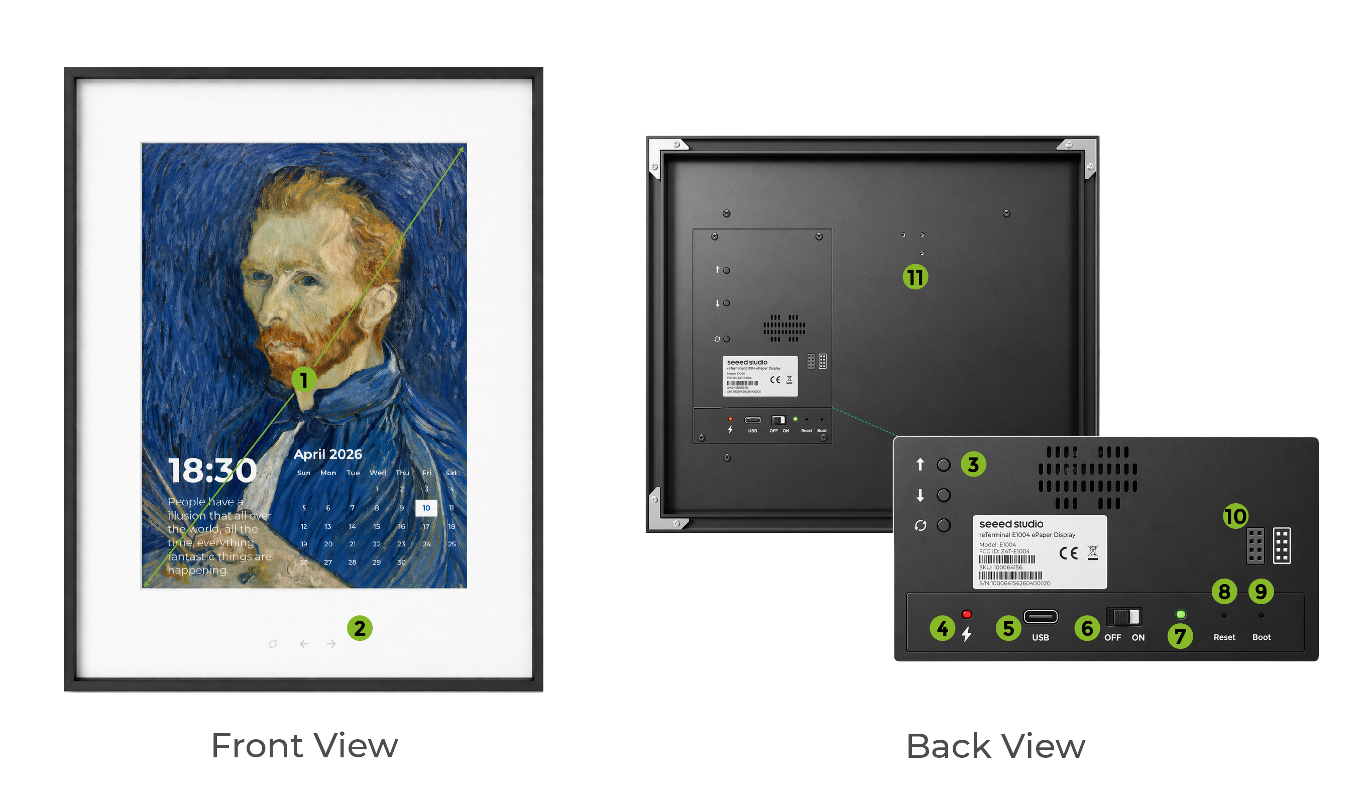 - Page Up / Down / Refresh Buttons: Physical buttons on the back for page turning and manually refreshing the ePaper display.