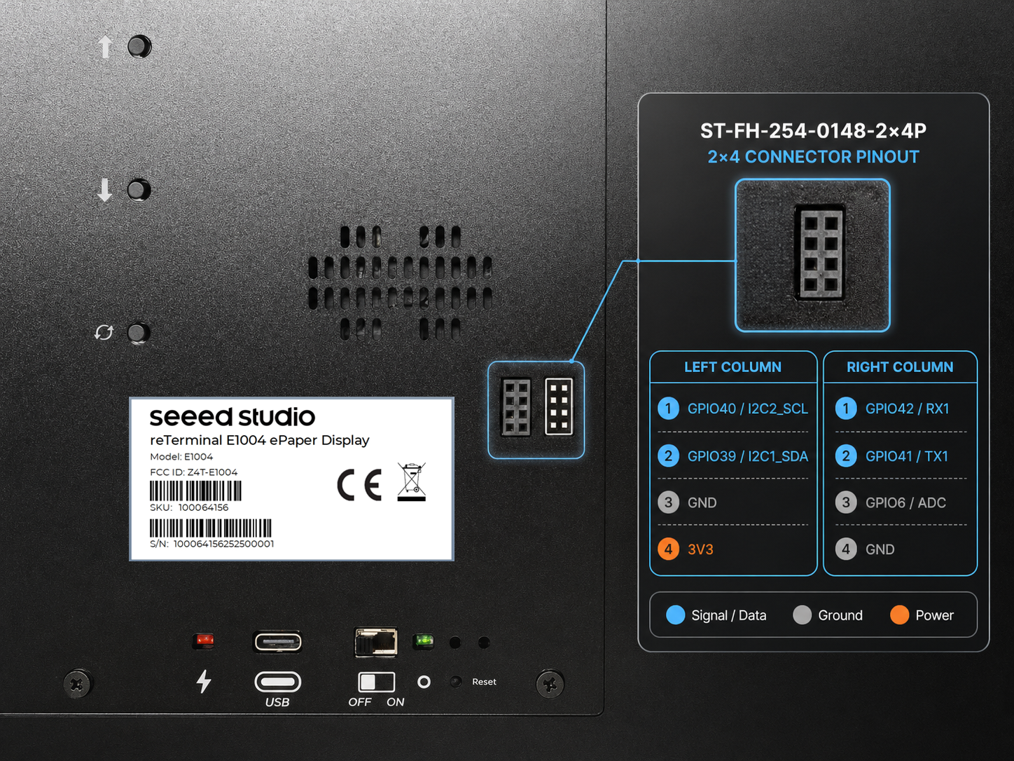 The reTerminal E1004 features an 8-pin expansion header (J2) that provides connectivity options for adding external sensors, modules, or other hardware to extend the functionality of your device. This expansion header exposes several ESP32-S3 GPIO pins and communication interfaces, making it a versatile connection point for your DIY projects.