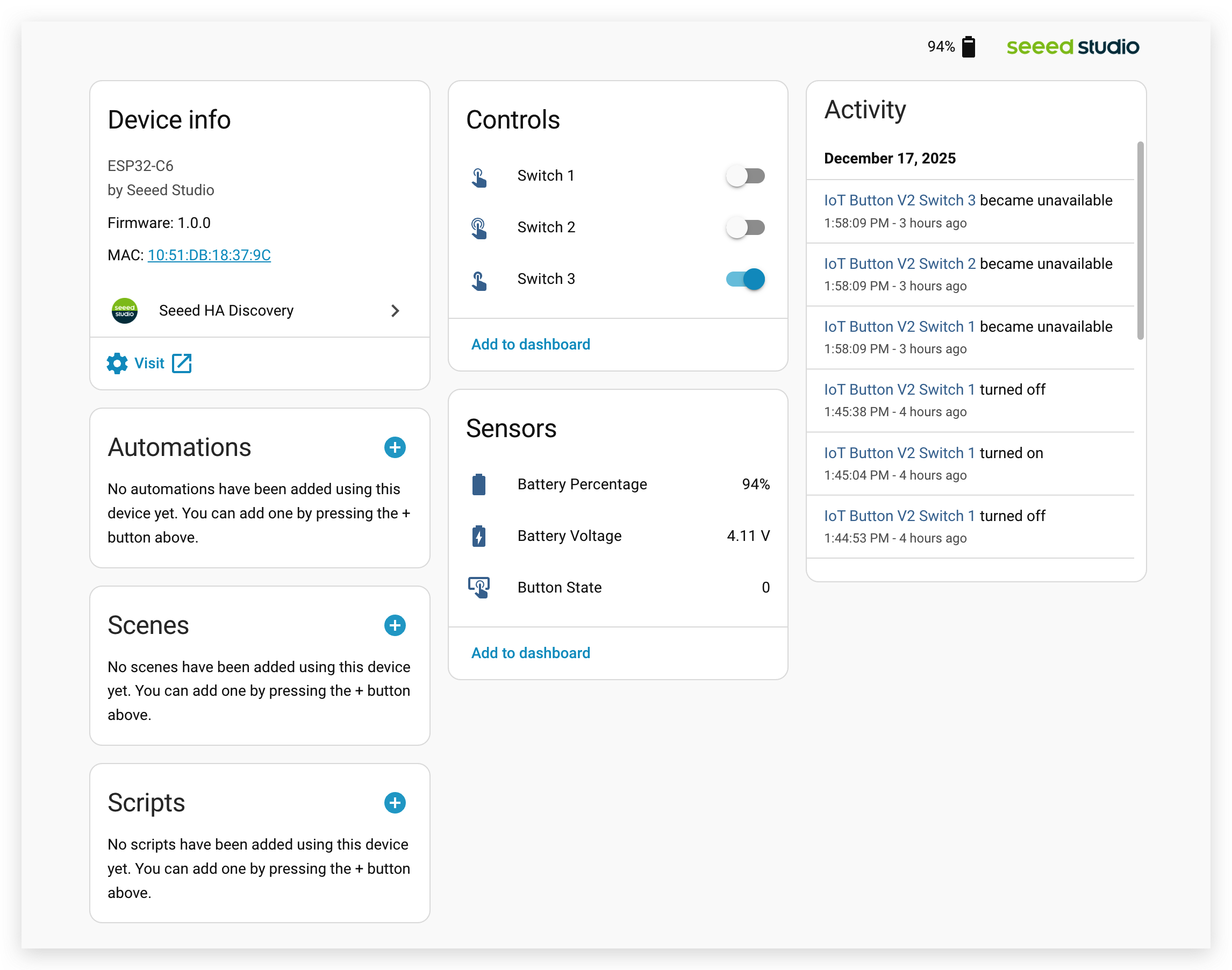 The Seeed Studio IoT Button V2 is a versatile smart switch powered by ESP32-C6, offering customizable RGB LED indicators, programmable event triggers, and USB-C charging capabilities. In this project, we'll guide you through connecting your IoT Button V2 to Home Assistant using the Seeed HA Discovery integration - a solution that makes it easy to connect ESP32 devices to Home Assistant with automatic discovery and real-time communication via WebSocket.
