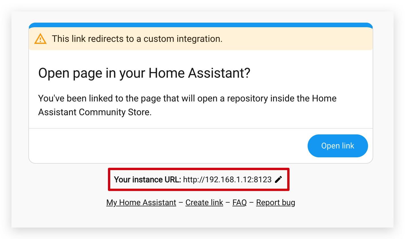 Step 5.3. A redirect page will appear showing your Home Assistant URL. Verify that the detected Home Assistant address is correct (it should match your Home Assistant's IP address or domain name).