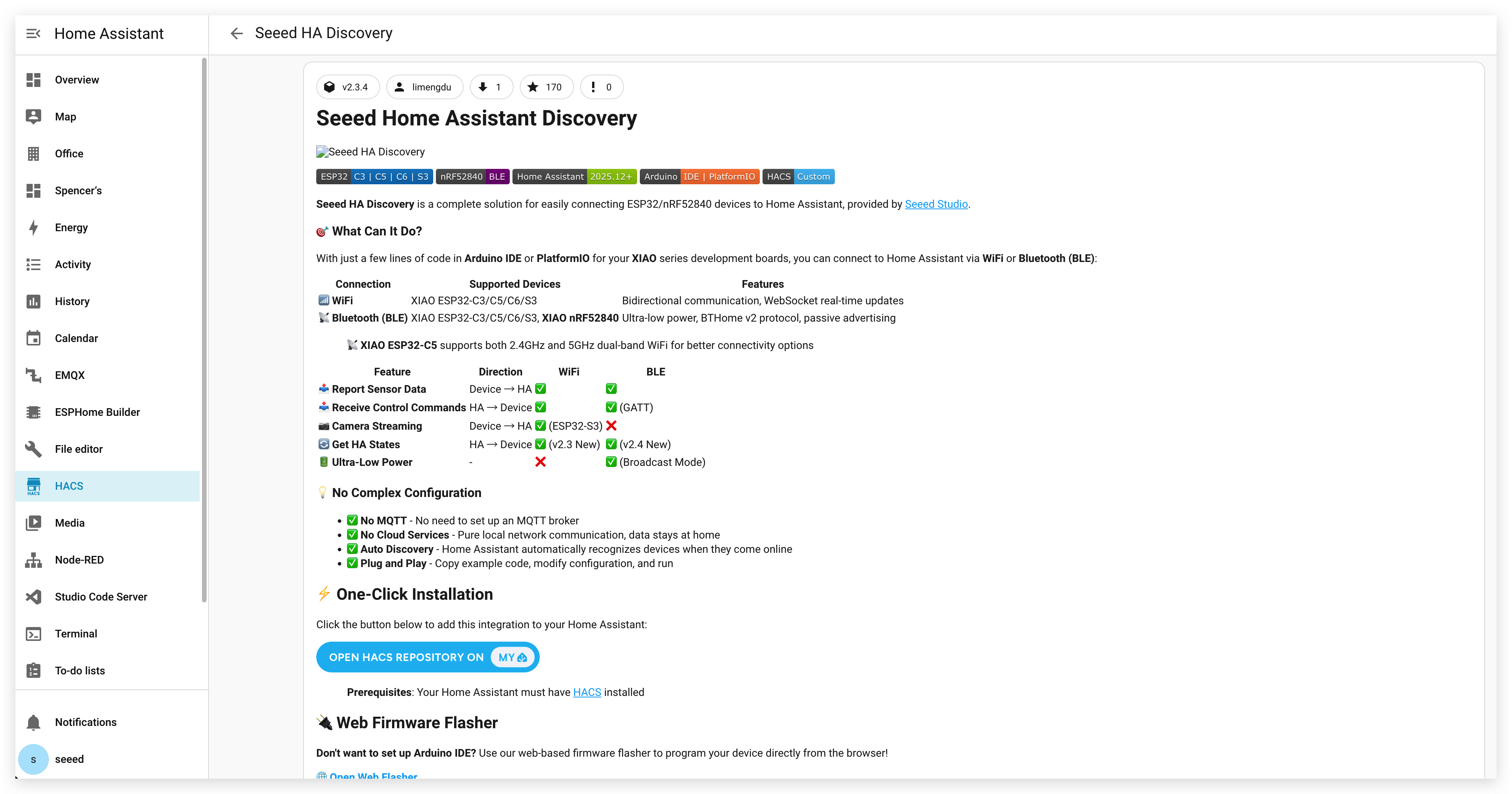 If you haven't installed HACS yet, please follow the official HACS installation guide to set it up first. HACS is required to install the Seeed HA Discovery integration.