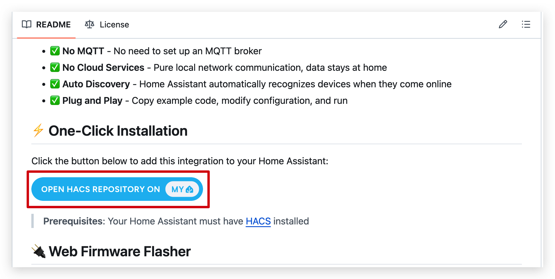 Step 5.2. In the README section, locate the ⚡ One-Click Installation area and click the OPEN HACS REPOSITORY ON MY HA button.