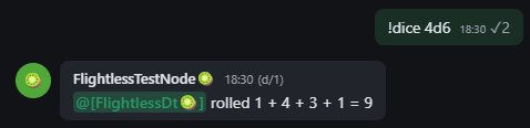 別の無線機を使用して #bot ルームに移動し、ダイスロールをリクエストします(例:"3d6")。出力は次のような表示になるはずです: