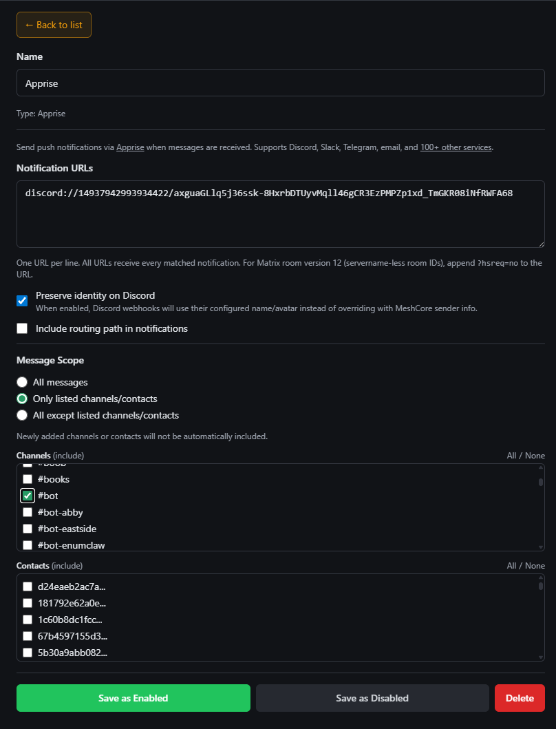 例として、特定の MeshCore チャンネル内のすべてのメッセージを、RemoteTerm 経由で Discord に転送するために Apprise を使用します。