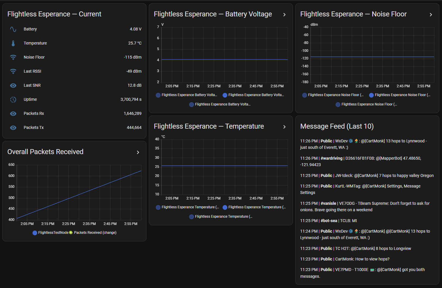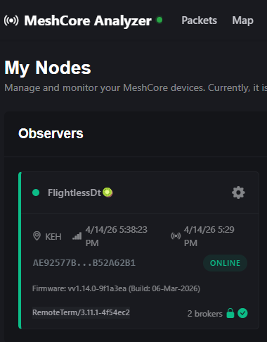 次に、このリンクに移動します。約15分以内に、そこであなたの無線機が緑色で表示され、自身のテレメトリとパケットがLetsMeshに転送されているのが確認できるはずです!