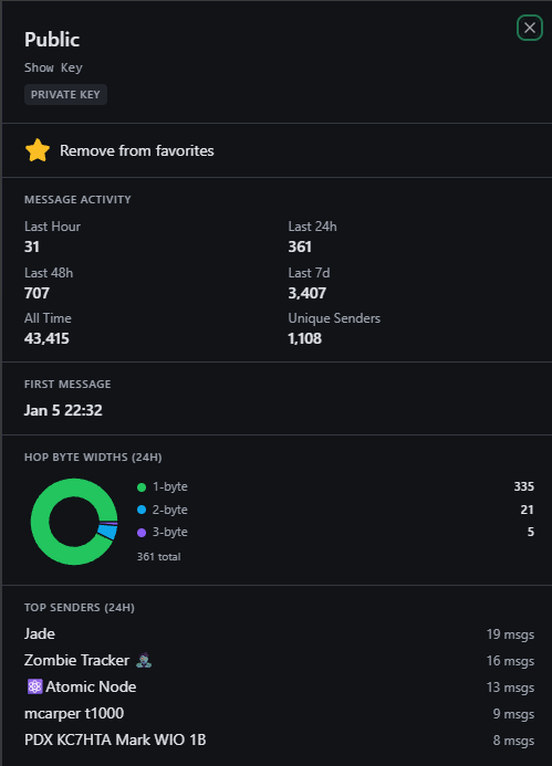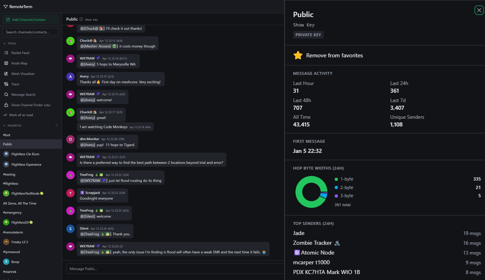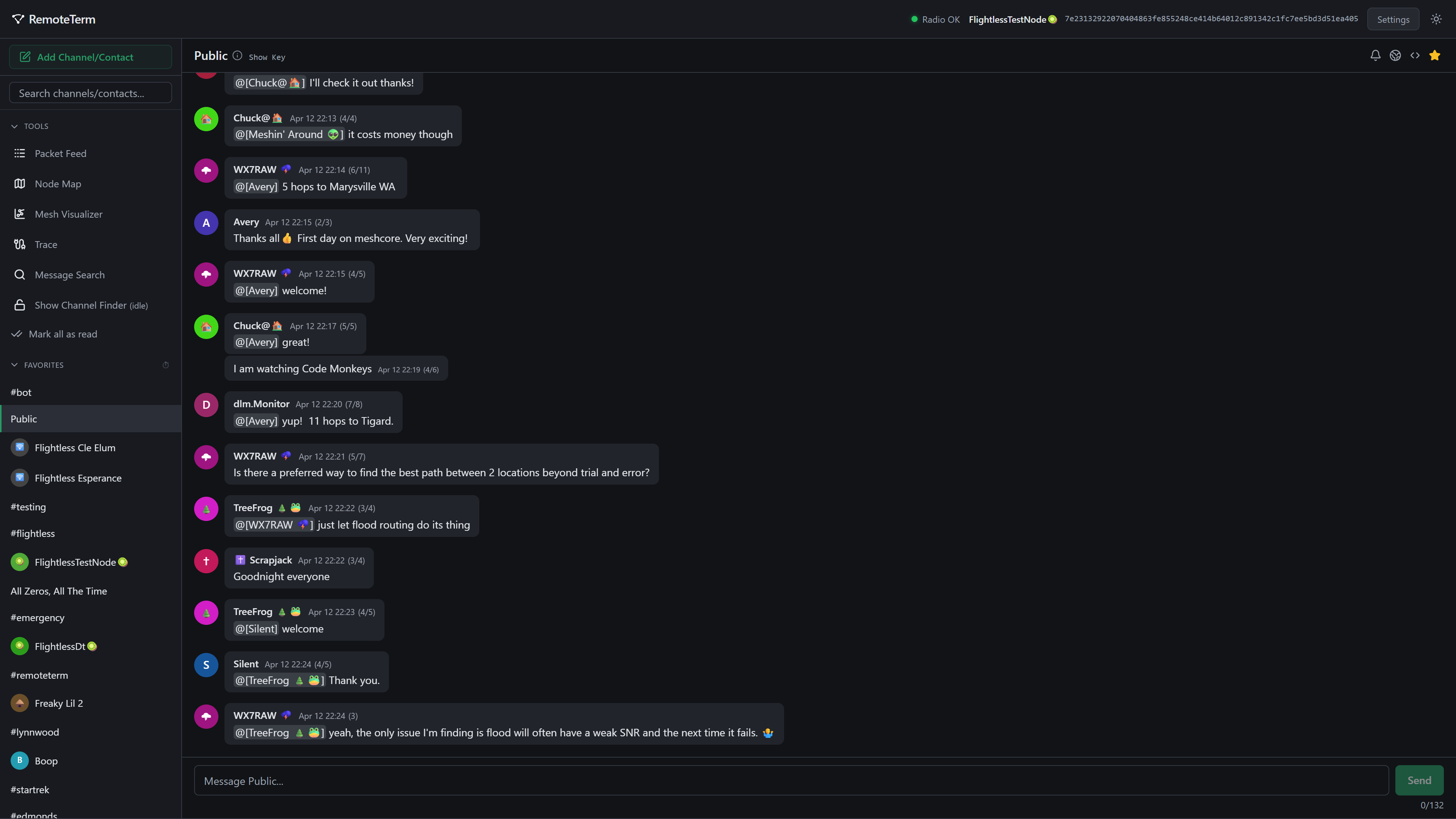 Public チャンネルは、すべての新しい RemoteTerm インスタンスに自動的に追加されます。ローカルメッシュには、Public、#test や #testing、#bots や #bot など、アクティブなチャンネルがいくつか存在する可能性があります。これらは、使い始めたり、新規ユーザー向けの良いローカルルームを案内してくれる人を見つけたりするのに適した場所です。