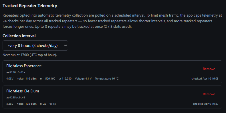 中継器のテレメトリ追跡を活用するには、目的の中継器を自動テレメトリ取得に登録する必要があります。登録されると、RemoteTerm は設定可能な間隔でテレメトリを要求し、履歴値を保持するとともに、最新の値を Home Assistant で参照できるようにします。
