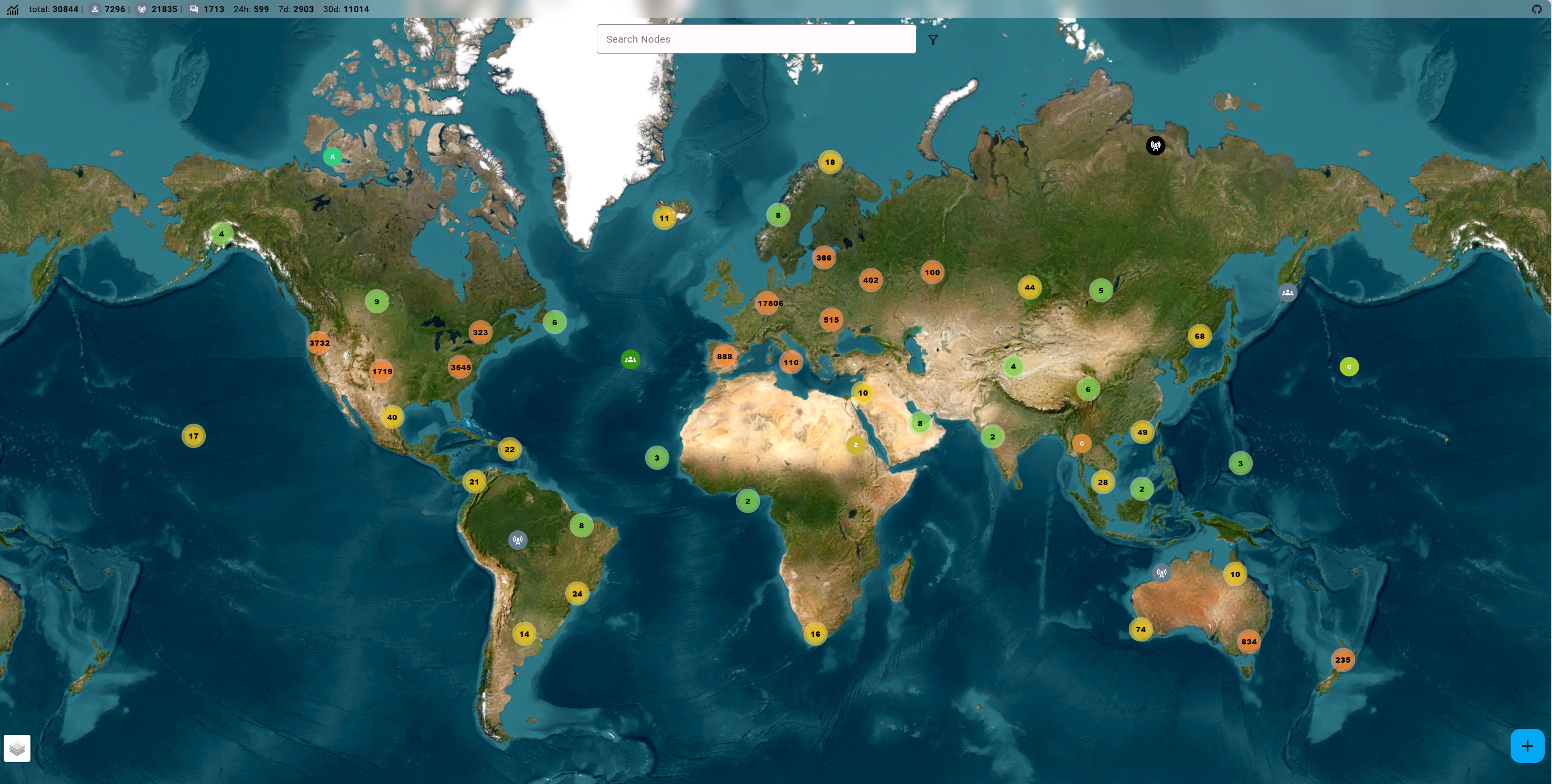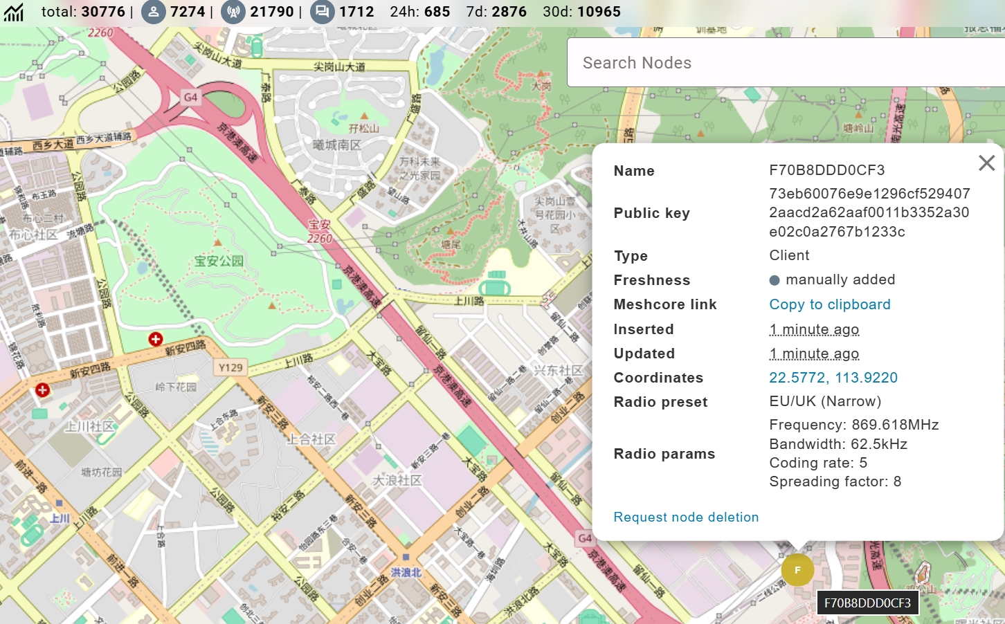 ノードマップはノードの位置をプロットすることで MeshCore ネットワークの状況をリアルタイムに可視化し、ユーザーがネットワークトポロジーとノード分布を把握できるようにします。