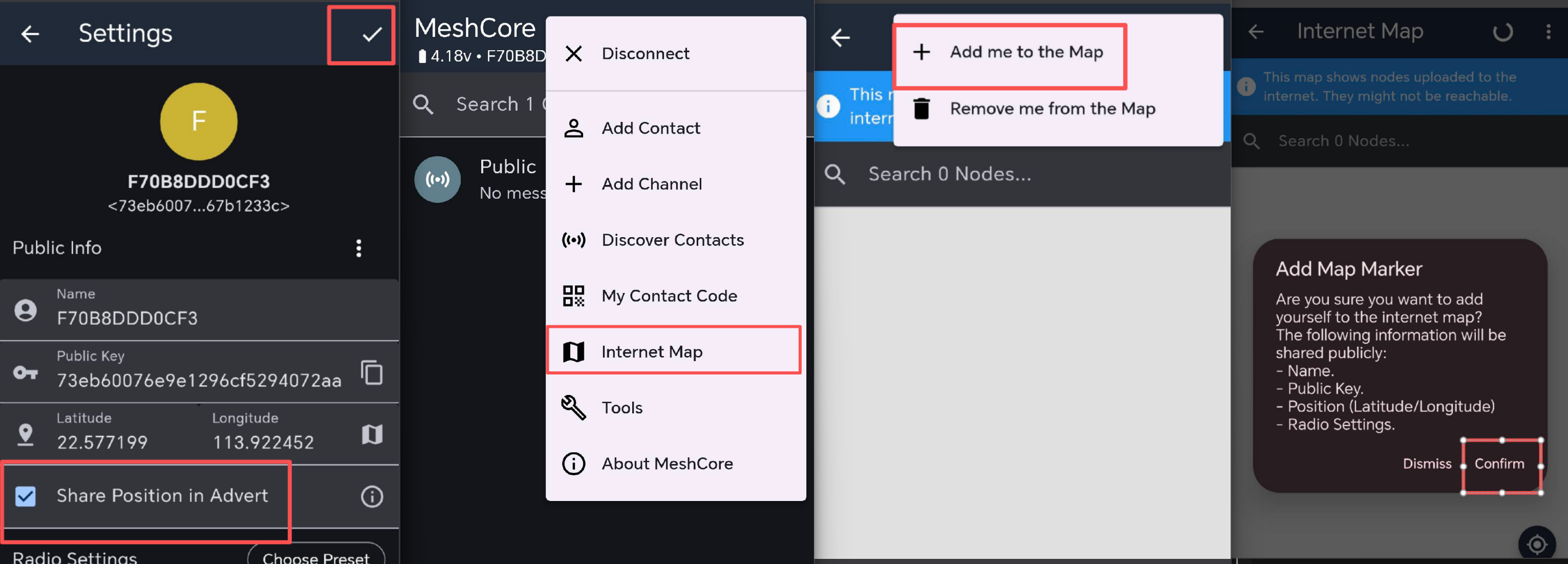 リピーターまたはルームサーバーを MeshCore ノードマップ上に表示するには、デバイスが位置情報を報告するように正しく設定されている必要があります。