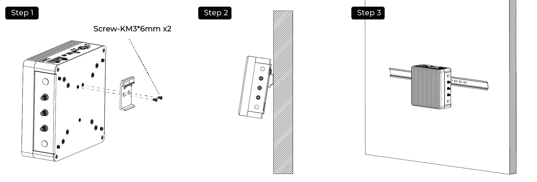 reComputer Industrial R21xxは、さまざまな取り付け方法を提供します。DINレールクリップと取り付けネジはパッケージに含まれています。図に従って、DINレールクリップをデバイス側面の取り付け穴に正しく取り付けてください。ネジがしっかりと締められたら、デバイスを取り付けレールに設置できます。