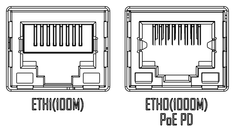 reComputer Industrial R2000には2つのEthernet RJ45ポートが付属しています。ETH0は、10/100/1000 Mbit/sの3つの異なる速度をサポートするCM5ネイティブギガビットEthernetインターフェースです。このインターフェースを通じてPower-over-Ethernet(PoE)配信を有効にし、reComputer Industrial R2000に電力を供給できます。もう一つのETH1は、USBから変換された10/100 Mbit/sをサポートします。