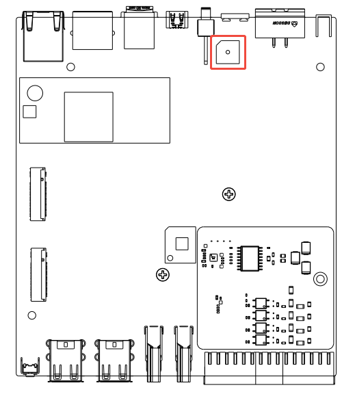 reComputer AI Industrial R2135のリセットホールには、ミニプッシュボタンスイッチが配置されています。このボタンを細い物体で押すことで、CM4をリセットできます。このピンがハイの時、CM4が開始されたことを示します。このピンをローにドライブすると、モジュールがリセットされます。