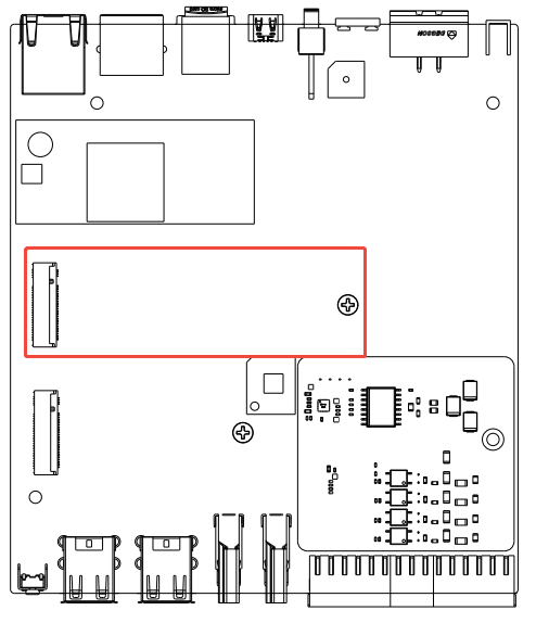 reComputer Industrial R2000のM.2 M-KEY 2280スロットは、128GB、256GB、512GB、1TB、2TBの容量のNVMe M.2 2280 SSDに対応するよう設計されています。このスロットにより高速ストレージ拡張が可能になり、ユーザーはシステムのパフォーマンスと容量を向上させることができます。