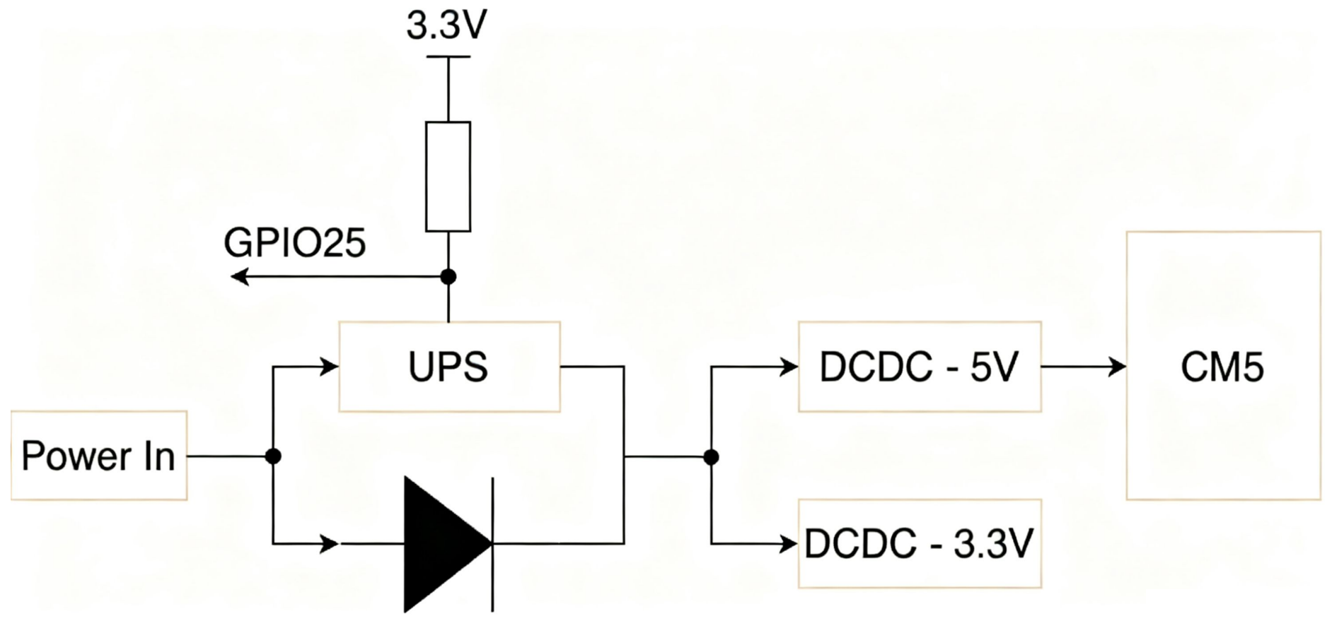 UPSは7Fで、直列で動作します。UPSモジュールはDC5VとCM5コンポーネントの間に配置され、5V電源からの電力損失の際にCPUに警告するためにGPIO信号が利用されます。この信号を受信すると、CPUはスーパーキャパシタのエネルギーが枯渇する前に緊急スクリプトを実行し、「$ shutdown」コマンドを開始します。 UPSによって提供されるバックアップ時間は、システム負荷に大きく依存します。以下は、4GB RAM、32GB eMMCストレージ、Wi-Fiモジュールを搭載したCM5モジュールでテストされた典型的なシナリオです。
