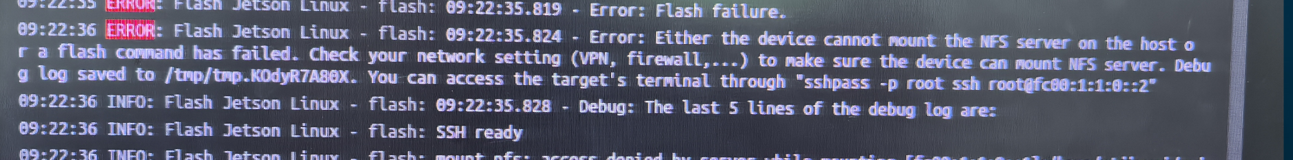 Either the device cannot mount the NFS server on the host or a flash command has failed.